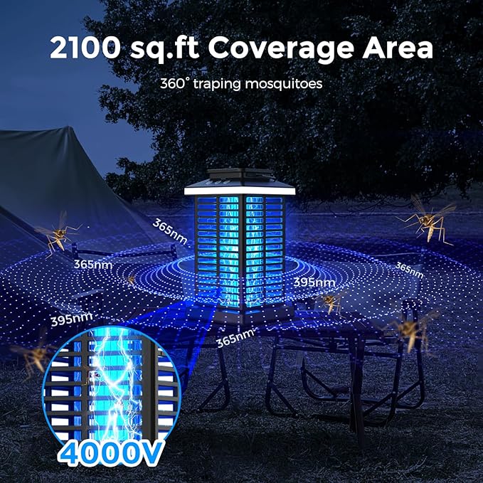 - 【High Effective Mosquito Zapper Lamp】This bug zapper outdoor lamp uses 360°range 365-395nm wavelength UV light to attract insects, then shock them by 4000V high-voltage electrical grid in physical method, it can effectively kill thousands of flies, mosquitoes, wasps, moths and other insects. Protects you and your family from pest infestations.